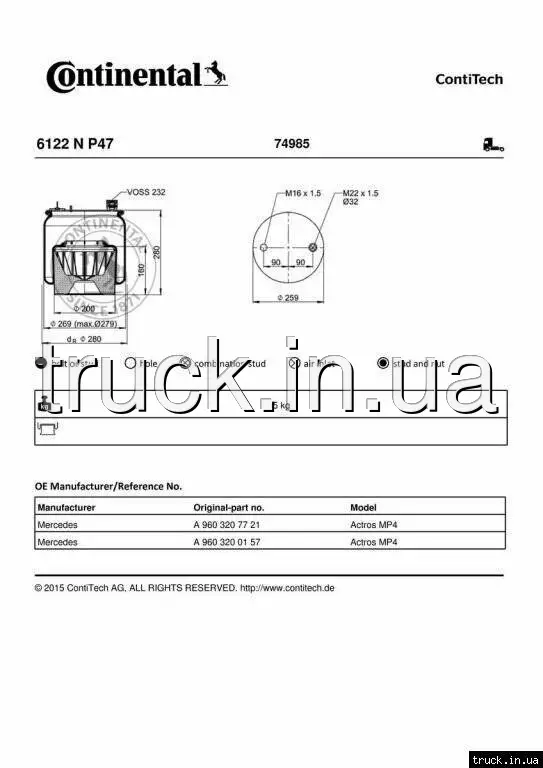 Пневмоподушка MERCEDES ACTROS 4 пластиковый стакан 6122NP47, 9603207721 === CONTITECH AIR SPRING ===